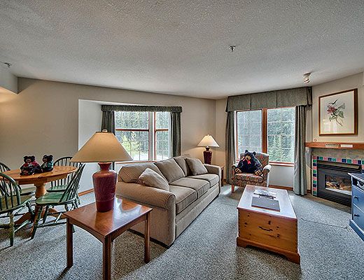 The suite features an efficiency kitchen, 1 bathroom, 2TV/1DVD, complimentary Wireless Internet Access, gas fireplace, common use area for ski storage, coin operated laundry facilities and common hot tub area. The dining room table seats 4 people. This 600 sq. ft. suite is roadside, faces Morrisey Mtn. and can accommodate up to 4 people. No pets and no smoking.