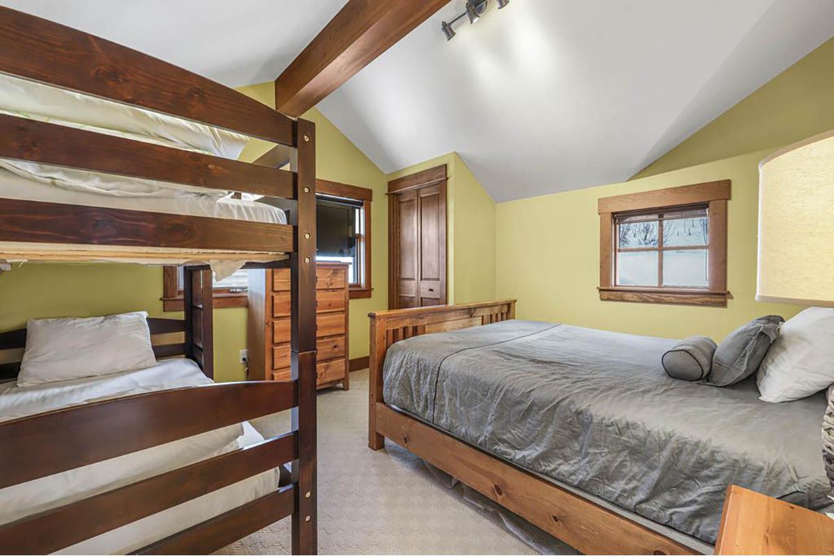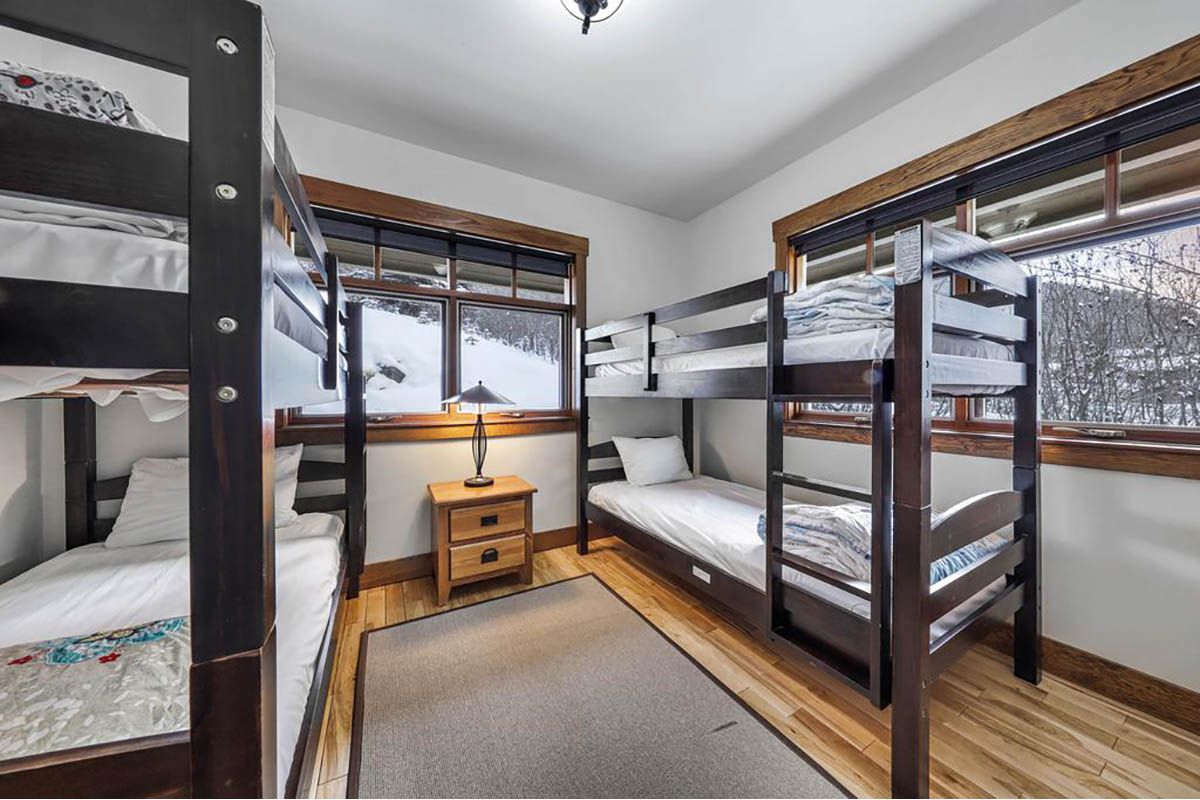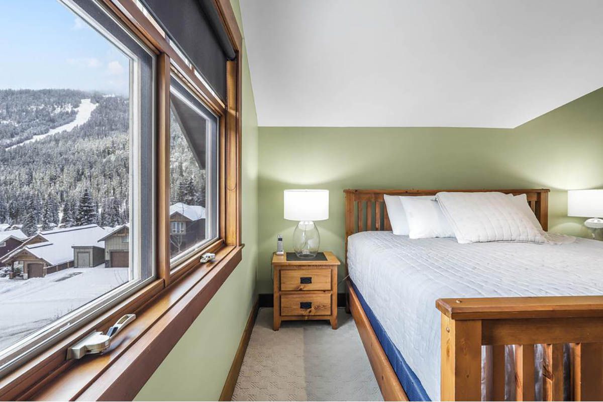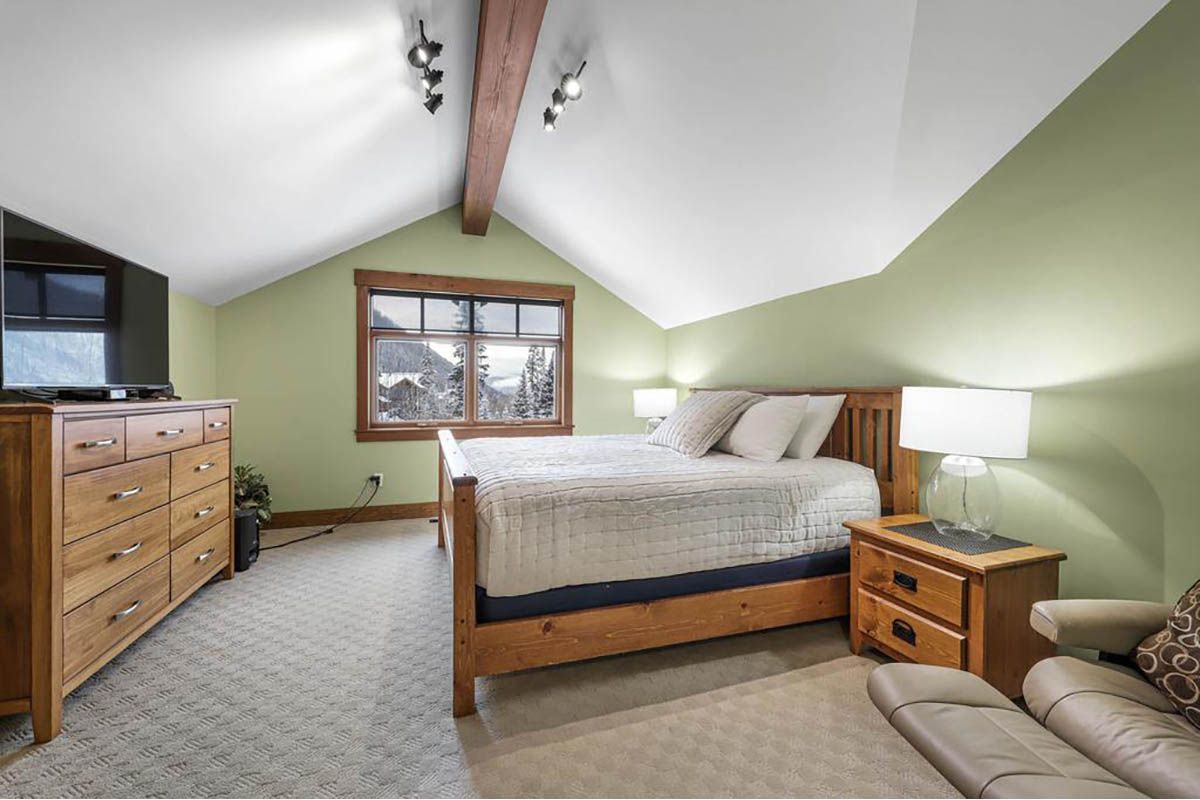 The third and top level of the chalet is home to the master bedroom, complete with an ensuite bathroom, seating area, and private balcony. This level also includes a full bathroom with a bathtub and hand shower, as well as a fantastic family room.