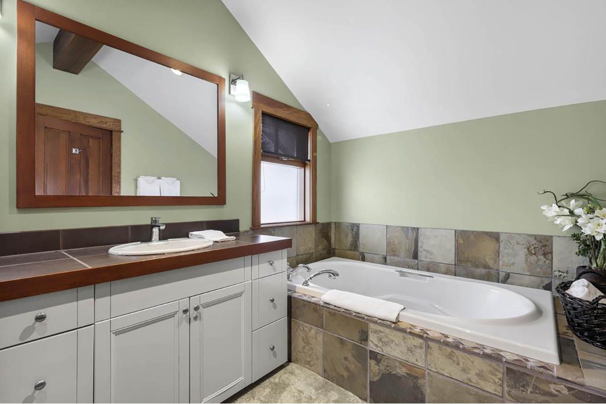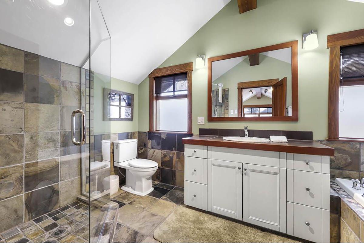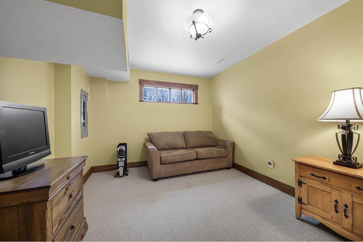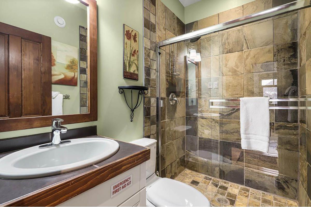 The third and top level of the chalet is home to the master bedroom, complete with an ensuite bathroom, seating area, and private balcony. This level also includes a full bathroom with a bathtub and hand shower, as well as a fantastic family room.