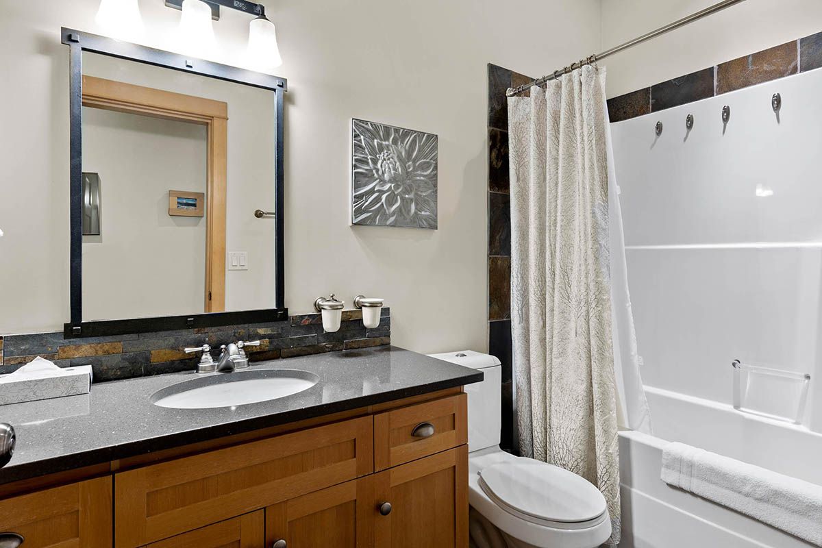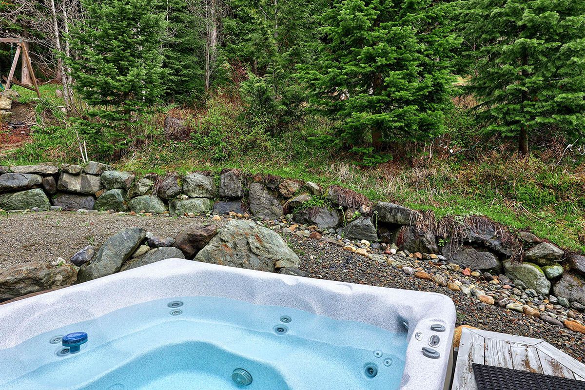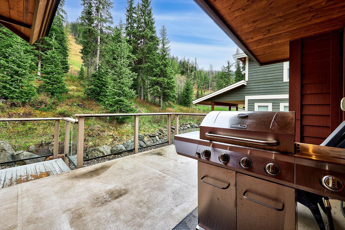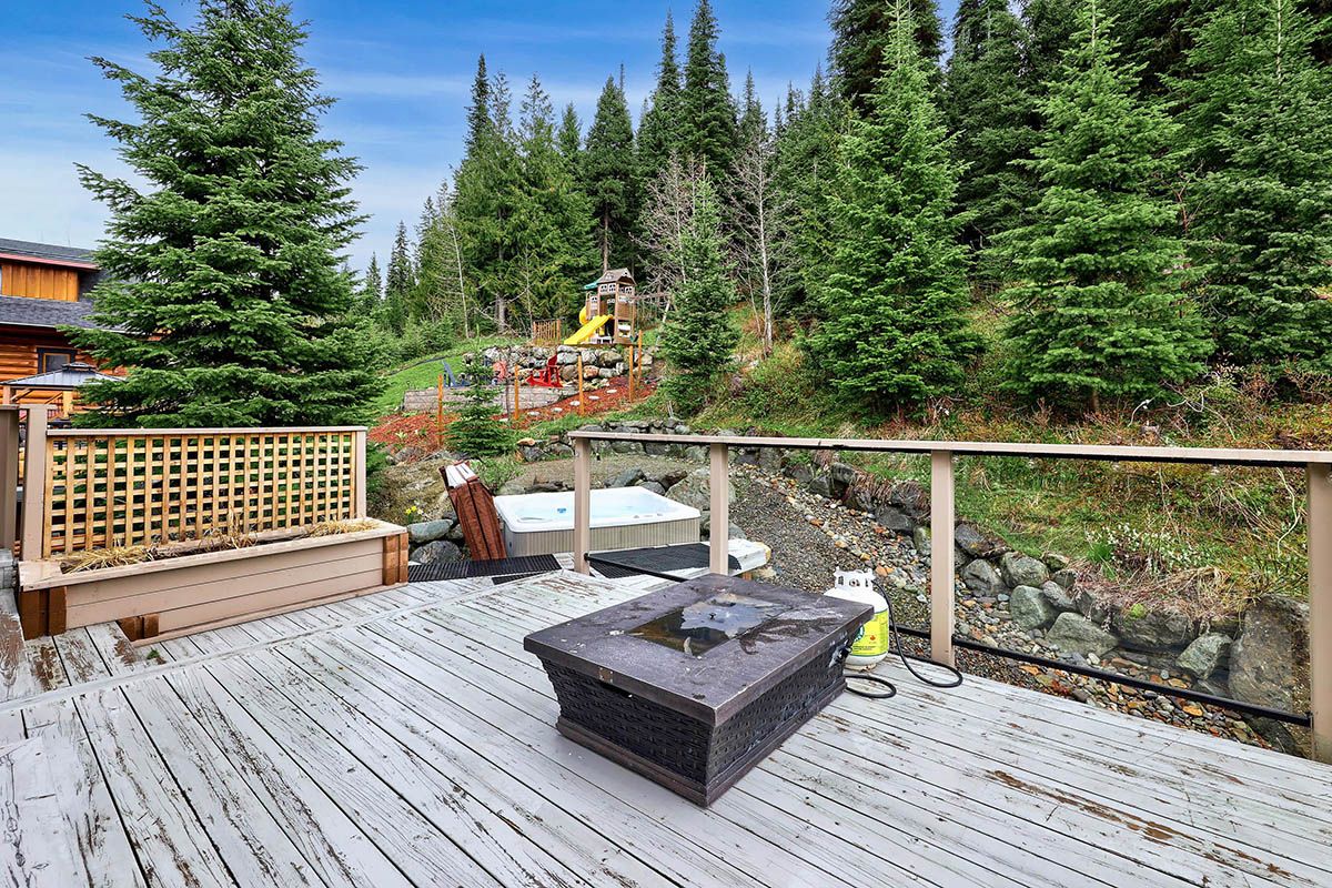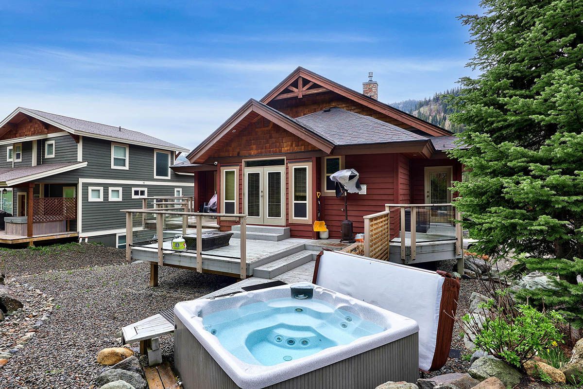 The back of the home has a deck/patio area that can be accessed from three areas indoors (the kitchen, master bedroom, and third bedroom), and has the BBQ, a propane fire table that your group can cozy up around, and the private hot tub to soak in after a long day of adventure.
